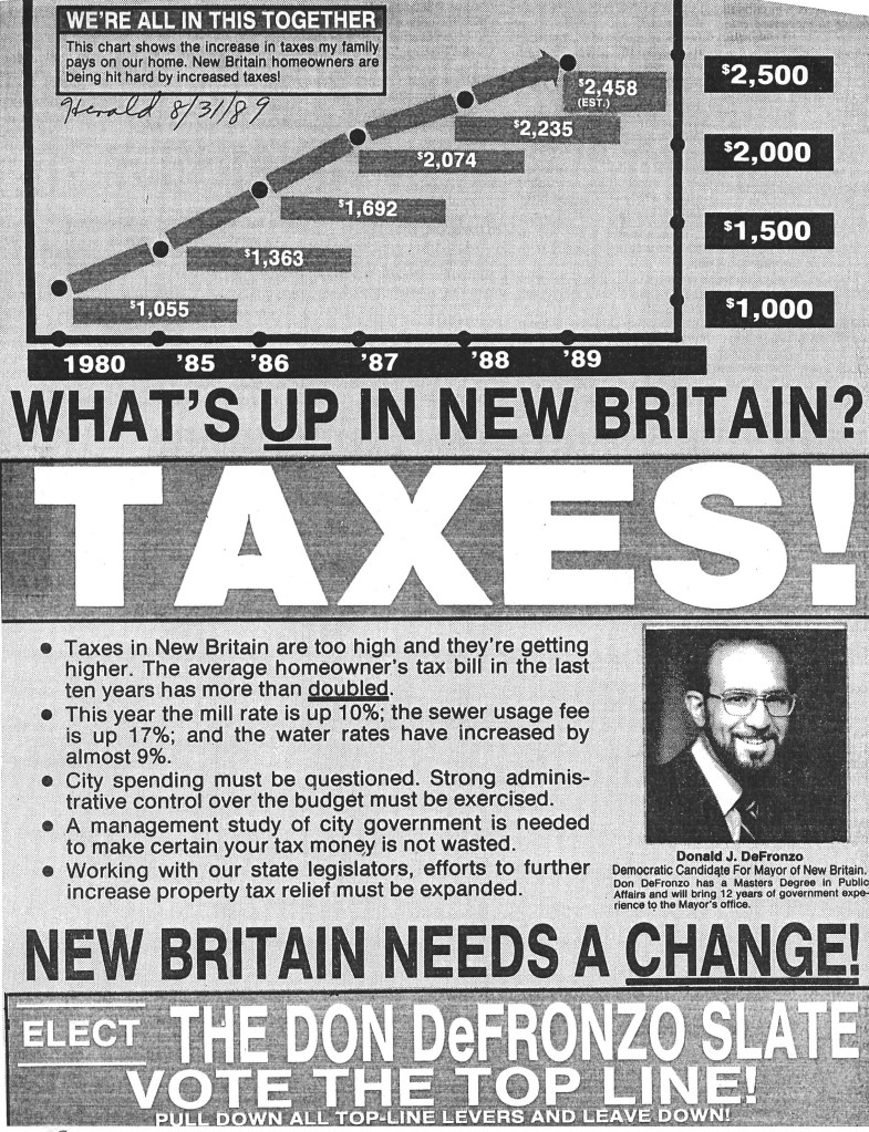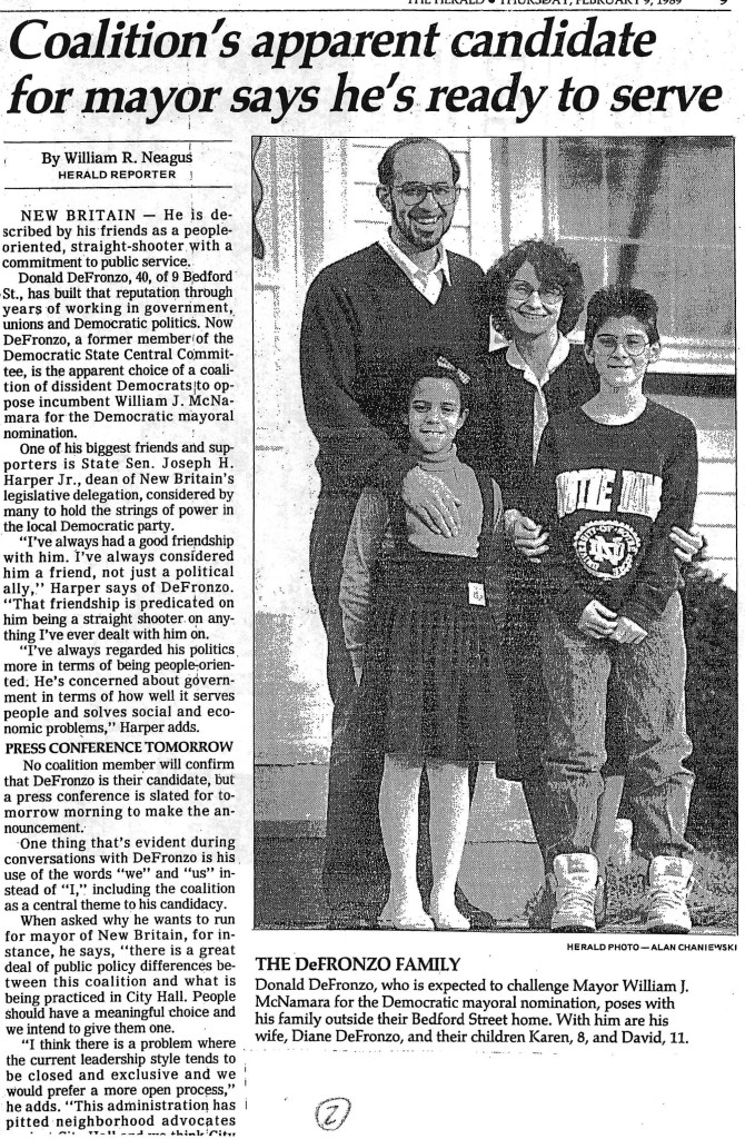 Watershed: 1989’s Mayoral Election, excerpted here, is DeFronzo’s personal account of the 1989 municipal campaign based on his observations, the recollection of friends and news coverage at the time. A copy of Watershed is on file in the history room of the New Britain Public Library. Thanks to Don DeFronzo for permission to publish an abridged version in this series. John McNamara