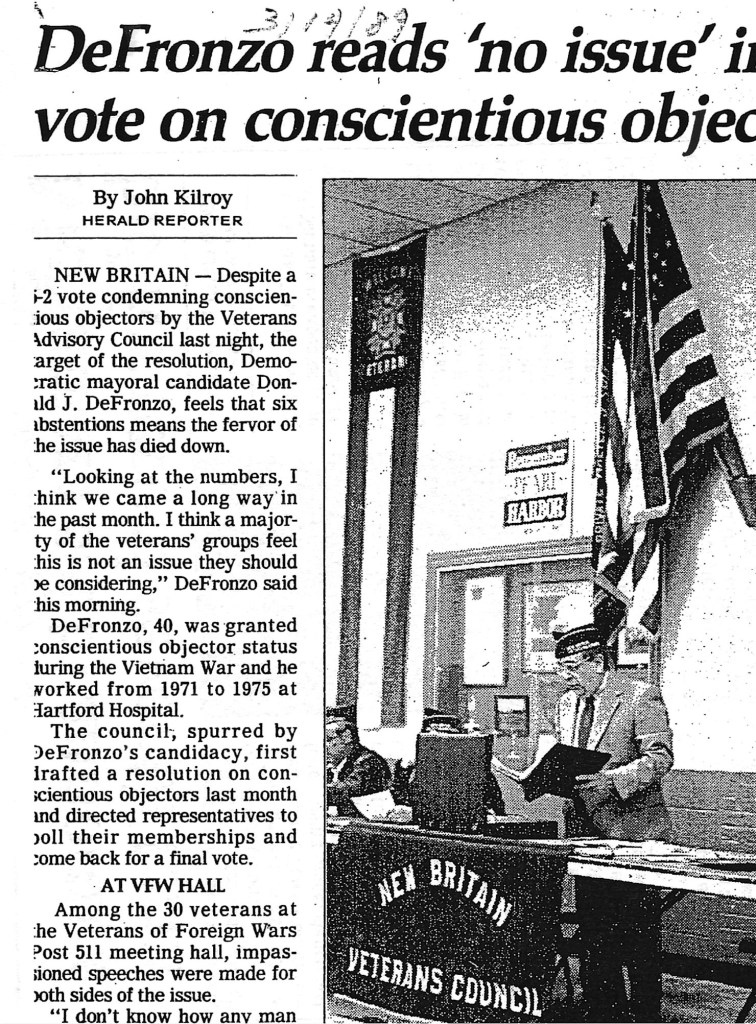 Another Courant editorial said, “… a CO is not the equivalent of a draft dodger or deserter. Mr. DeFronzo should be judged on the merits of his vision for New Britain…”