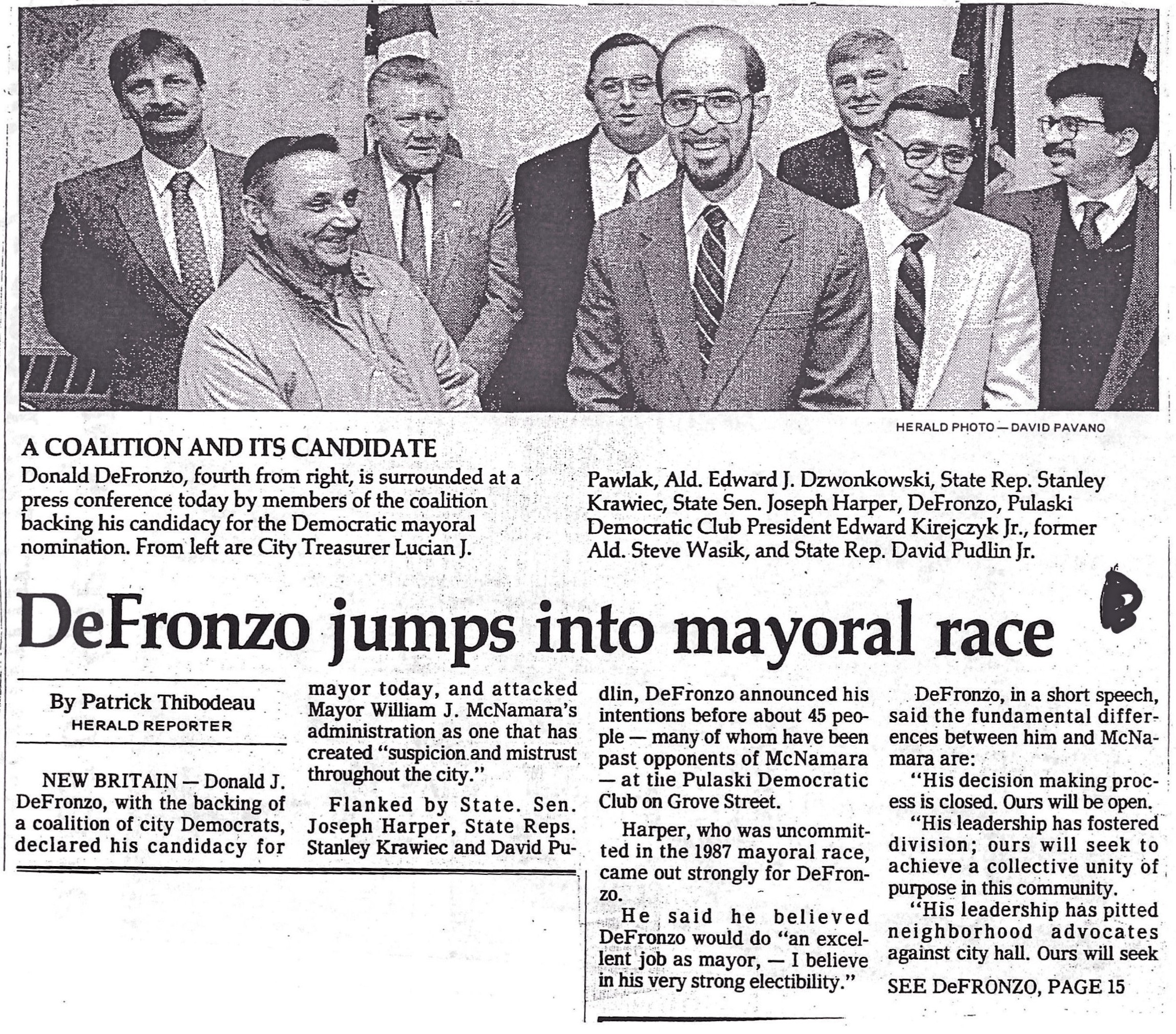 Up until then, having never sought public office, I never had to confront the conscientious objector (CO) issue head on. As we moved into 1988 the prospects of a DeFronzo mayoral candidacy became more real. Senator Harper, leader of New Britain’s progressive wing, formed a political coalition with State Representative Stanley Krawiec, leader of the more conservative Polish American faction. Other members of the coalition were Lucian Pawlak, current City Treasurer, Steve Wasik, Alderman Edward “Butch” Dzwonkowski, President of the Pulaski Democratic Club Edward Kireczyk, Progressive leader and State Representative David Pudlin and Walter Clebowicz, a former alderman and harsh McNamara critic. Pawlak, Wasik and Dzwonkowski were affiliated with the Pulaski Club and Wasik had run for mayor unsuccessfully as an Independent. Dzwonkowski was a popular alderman who had lost a primary challenge for the State Senate seat to Joe Harper several years earlier. Clebowicz had been a very popular alderman who mounted an impressive independent race against McNamara in 1979 in which he amassed over 4,000 votes. The coalition would grow to include representatives of the growing Puerto Rican community, neighborhood activists and a number of former McNamara allies looking for a new home, including Jim Leavenworth, a skilled media professional.