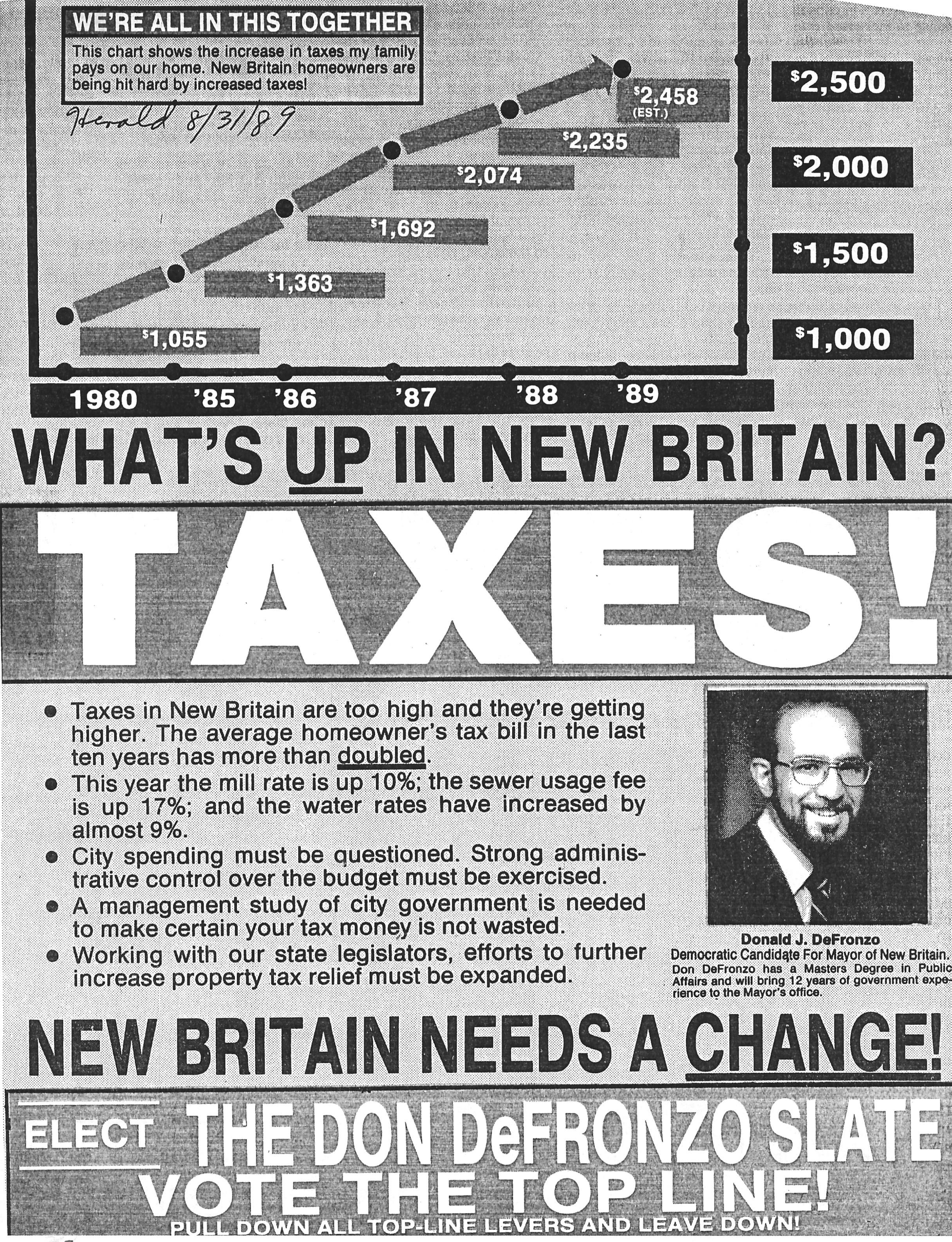 DeFronzo, active in the Democratic Party from his college days at Fairfield University to the present, won the mayoralty backed by a broad-based coalition of Democrats and a personal door to door campaign that began in the winter of 1989 and continued into the primary and general election.