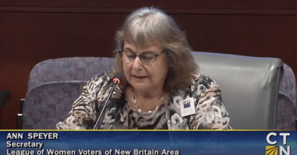 At the March 7th hearing on SB 7125 more than 20 individuals spoke in support of the bill, including representatives of the state LWV and LWV chapters in the state. Local LWV members and New Britain residents who submitted testimony included NB-LWV President Mary O’Brien, Kerry Ann Kowar, Marjola Nelson, Aimee Pozorski, former State Senator Terry Gerratana, Attorney Ken Speyer and Peggy Riotte.