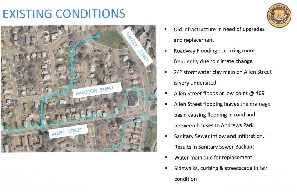 Since the summer of 2023 a dramatic jump in flooding from extreme weather led to a public outcry in New Britain, especially from residents in the Overlook Avenue-McKinley Drive and Allen Street neighborhoods. The public pressure eventually led to new plans and capital funding for Allen and Overlook where extensive damage occurs. The city addressed flooding at Overlook and McKinley, a $2 million project, with remaining federal American Rescue Act funds last year.