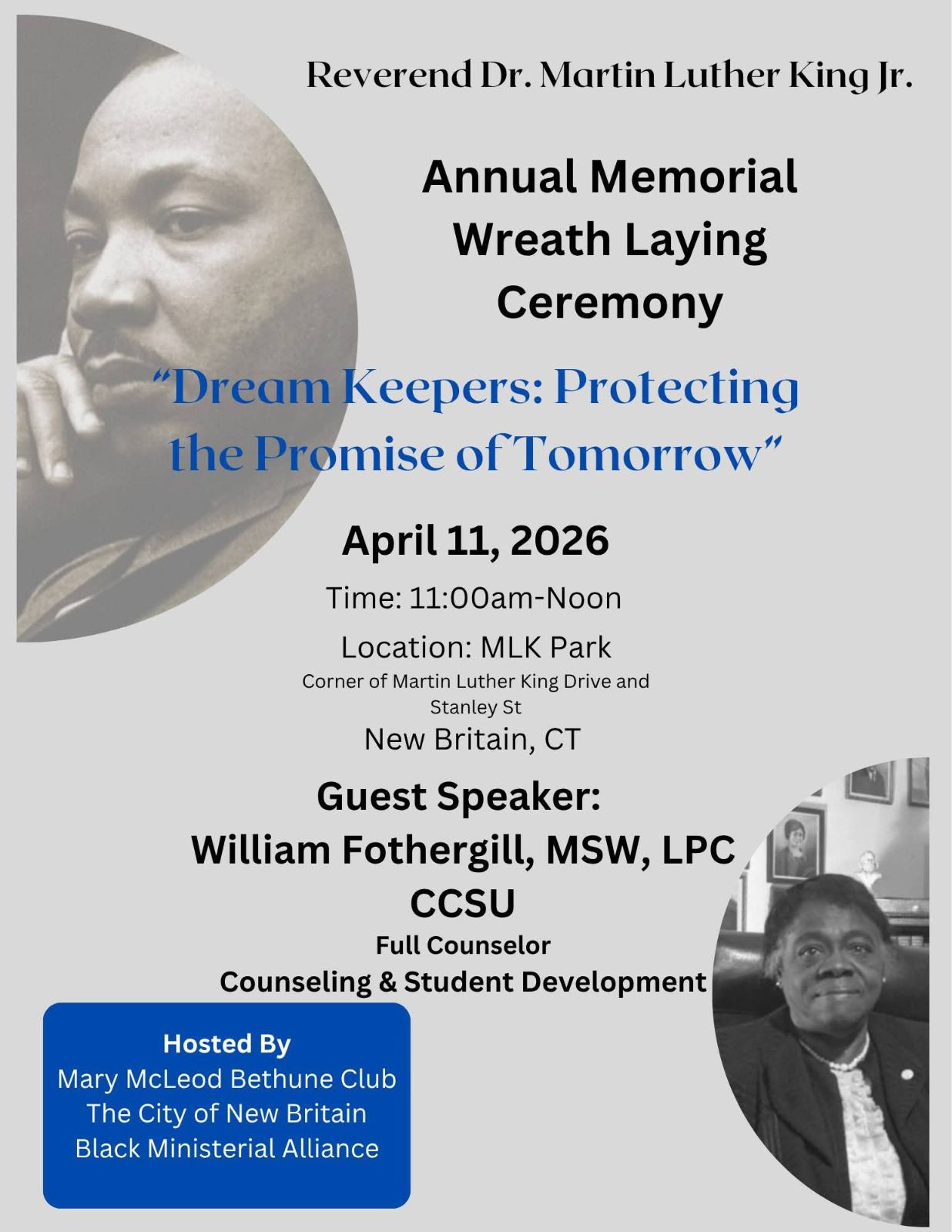 New Britain will observe the 58th anniversary of the assassination of the Rev. Martin Luther King, Jr. on Saturday April 11th with a wreath laying at MLK Park at 11 a.m. The annual observance will be hosted by the Mary McLeod Bethune Club, City of New Britain and the Black Ministerial Alliance with remarks by William Fothergill, MSW, LPC of CCSU’s Counseling & Student Development Center.